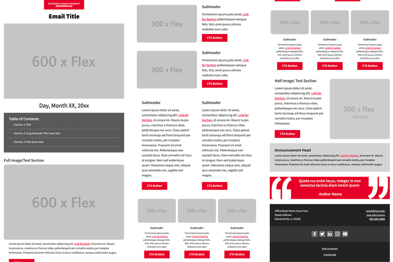 This project is rooted in bringing all elements of Southern Illinois University of Edwardsville’s digital presence in line with the updated branding that was rolling out. The template was developed with a combination of MLJL and CSS/HTML to be accessible, on-brand, and compatible with all major email clients. This project evolved into partially managing and onboarding departments into the Mautic email system. The template draws on my background in publication and web design and provides a multitude of preformatted blocks to give the departments more versatility in their communications. See samples of the base template below.