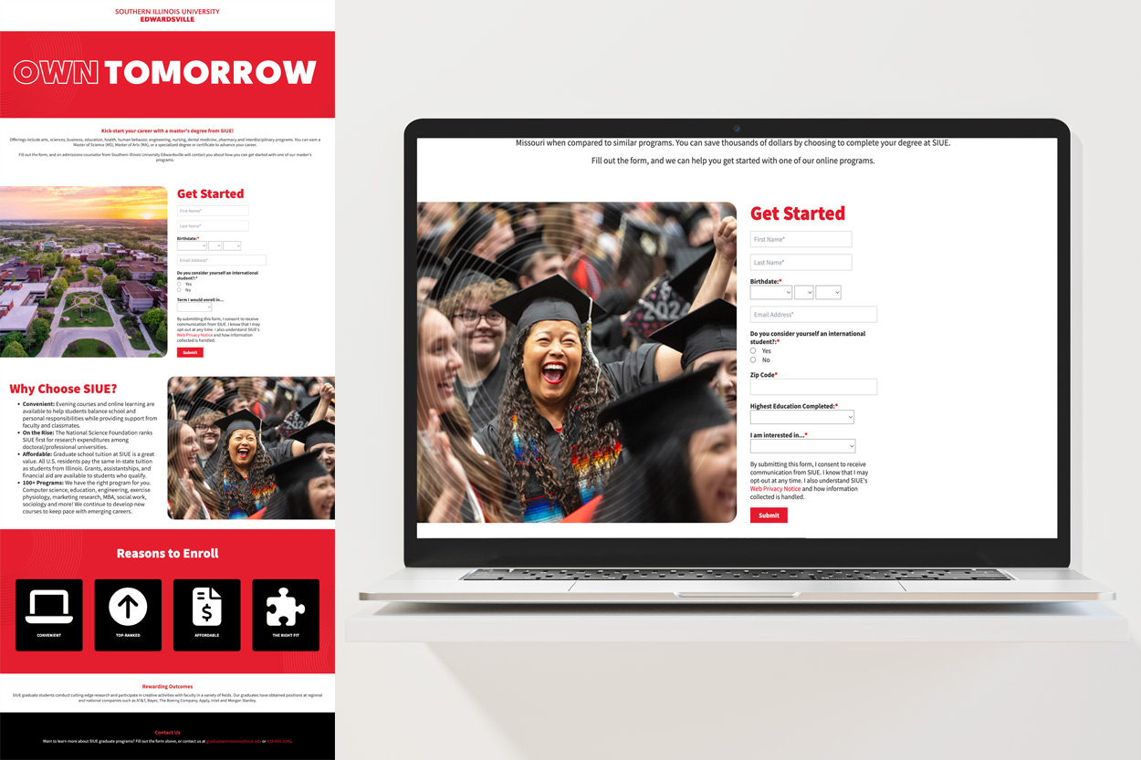 This project utilized a modified version of my cascade template design to provide the user with a funneled flow to complete the forms. Testing metrics showed that the new design nearly doubled advertising leads, making it the highest yet. Through this project, I was able to use the versatility of the template system to implement the current branding campaign “Own Tomorrow” while also using CSS in our free-form block to expand the template by developing new block components.